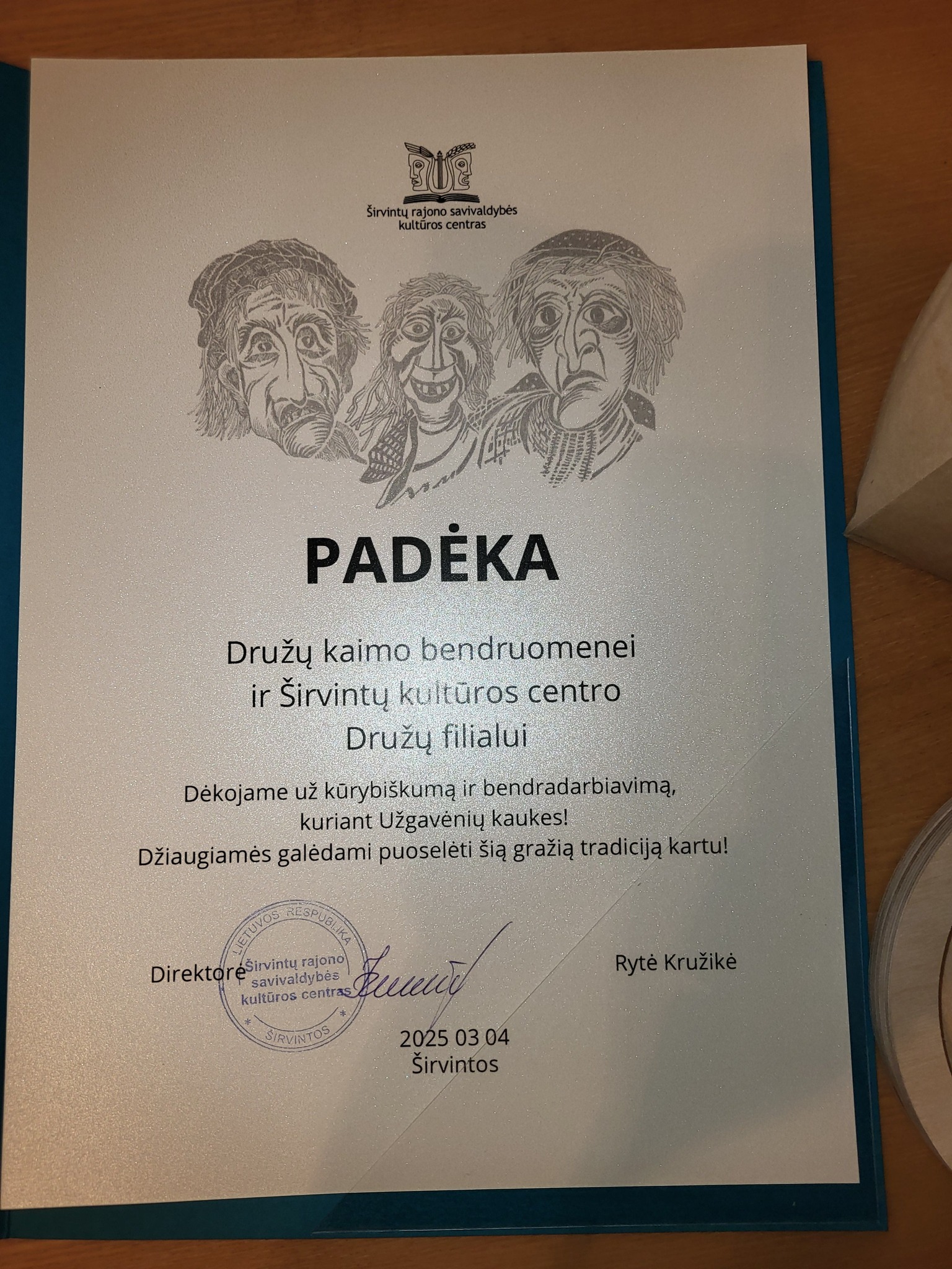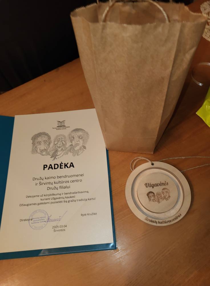 Družų kaimo bendruomenės ir Širvintų KC Družų filialo Užgavėnių kaukė jau pasiruošusi į Kaziuko Užgavėnes! Aplankykite- ji laukia Jūsų! Užgavėnių kaukė – tai ne tik persirengėlio veidas, bet ir magiška perėjimo į pavasarį simbolika. Ji slepia kasdienybę, išlaisvina vaizduotę ir kviečia į siautulingą šventę, kurioje juokas nugali žiemą. Ryškios spalvos, groteskiškos formos kuria ypatingą nuotaiką – šėliojimą, kuris išvaro šalčius ir pažadina gyvybę!